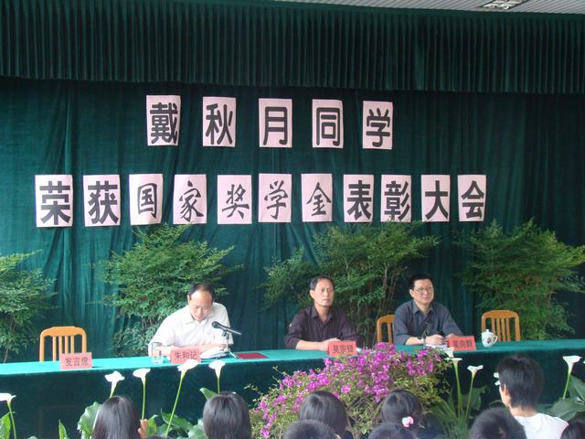 会上,国家奖学金获得者戴秋月同学作了汇报发言。学生代表许雄同学发言,他代表全体同学,首先向戴秋月和“励志奖学金”获得者表示祝贺,并倡议全体同学认真学习,爱国守纪,做一个正直、文明、好学、上进的新时代的大学生。